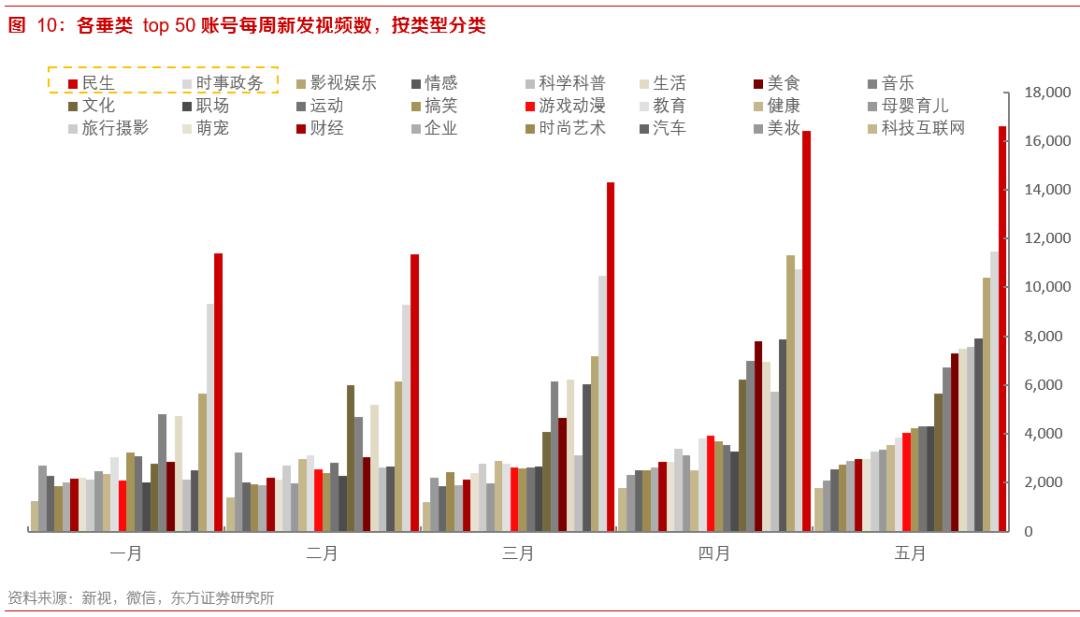 从视频号平台发布的内容数量看,从新闻直接到大众生活的民生,时事政务类内容发布数量过多,每月都有大量发布的属于25%的新内容民生和时事政务;从的角度看,民生和时事政务类账户每天每天都会发布8-10个视频内容,而其他垂类的账户则平均至多发布3-4个视频内容。