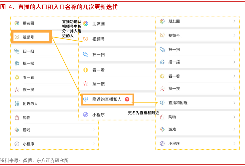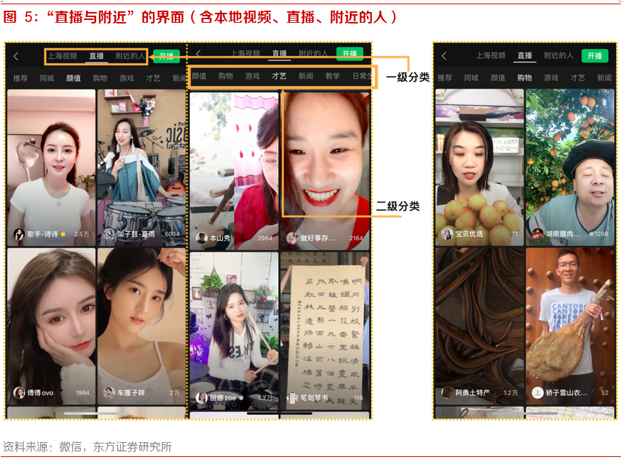视频号上线,直播和短视频两种内容形态均从“视频号”入口进入;随后,直播被从视频号入口中分离,并入附近的人,进入“附近”的直播和人”的“近”开始暗示,功能发生本地生活和地域的邻近性,也有一定的时间证明视频了视频的直播号是用户去分享一些本地的事件(例如线下活动等) 。
