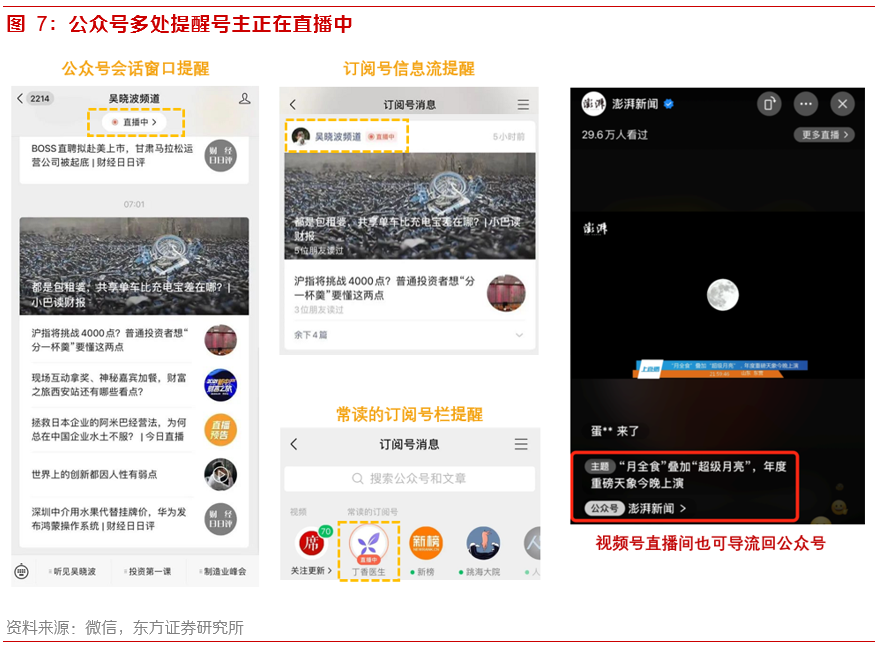 2 )公众号强提醒为直播导流(进一步打通公众号和视频直播号之间的关联)在2021年5月26日的更新后,直播获得了来自公众号的流量支持。当号主在进行时,视频号关联的公众号的多个位置“直播中”,提醒展示频道引导阅读号粉丝进入直播间,在订阅号信息上展示流向、公众号会话窗口、常的订阅号中, “直播中”的标志展示;一旦被通过公众号导流进入视频号直播间的用户,就可以在直播间的网页链接公众号主页链接,可点击从直播间回到公众号。历次统计。视频号功能更新后,可以发现公众号和视频号之间的联系不断加强,预示着微信生态给创作者的同时提供了图文、视频、直播等多种内容形式的创作选择。