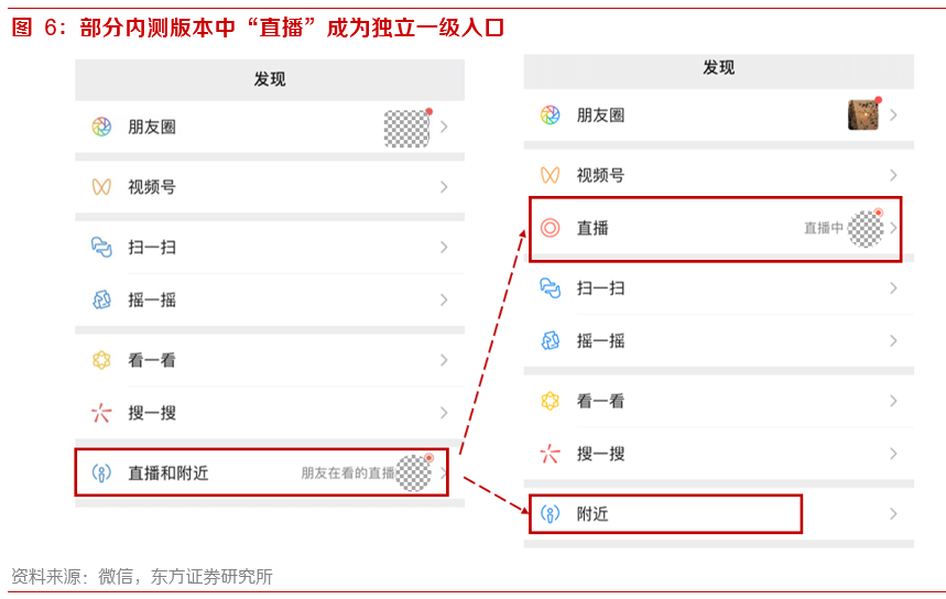 直播进入独立入口(内测中):6月,部分用户的微信更新后,部分用户的微信更新后,入口被拆分了,“直播”变成了一个独立入口被展示在“视频号”入口处,“附近”也成为了独立入口(进入后的3个页面是同城视频、同城直播、附近的人)。至此,视频号在微信的“发现”页面就拥有了3个独立一级入口(视频号) 、直播、)。而直播为自己创作的朋友视频主题的内容形态,在视频号内的重要进一步提升。