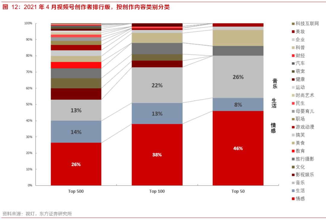 除了具体的内容,我们同时还关注了视频内容的创作者。张小龙在2021年的微信公开课上发送了视频号一个定义:“人都可以创作好内容的平台”,可见视频号的初心是希望所有的人都可以在这个平台上发布内容、生活,人都应该是这个平台的发现者。根据2021年4月的视频发布前500名创作者排行榜分享,可以,情感、音乐、生活三大类创作者的数量上限,且越近看的头部,三类创作者的表现类:500列表中,情感/音乐/生活三类创作者占比例刚过半(265/500);Top 100列表中,这三类创作者的膨胀提升到73%;到了Top 50的列表中,三类账户的比例提升至84%。而其他综合型短视频内容平台,创作者类型的集中度并没有那么高,以抖音为例,根据新榜数据,2021年4月抖音热度百强创作者中最热门的创作者类别分别为邀请、明星和政务,三者共祝福49%。