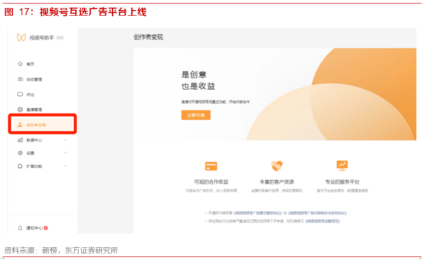 进入单一和平台抽成:根据微信视频号创作者权益指南,当视频号的参与人数达到1人,完成名认证和视频号认证,并持续发表原创优质内容的视频号主有机会加入互助选择平台。目前,平台的抽成比例为10%,即视频号的号主在完成推广任务后获得的税前收入,成为广告主报价的90%。至此,整个微信号的化基础商业商业设施已经包括:直播打赏、直播带货、内容付费推广、达人接单平台,除了没有信息流广告之外,大的基础设施框架基本完整,达人的流量变现途径基本可以和抖快钉创作者在视频号生态内,可以形成:内容创造→完成冷启动→流量→流量变进一步增长的完整还原现→的商业化路径可以鼓励创作者们更积极地进行内容创作,有生态的生态和成长。