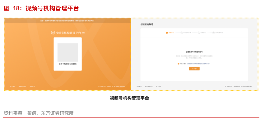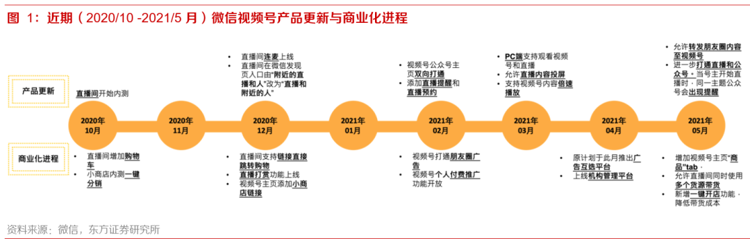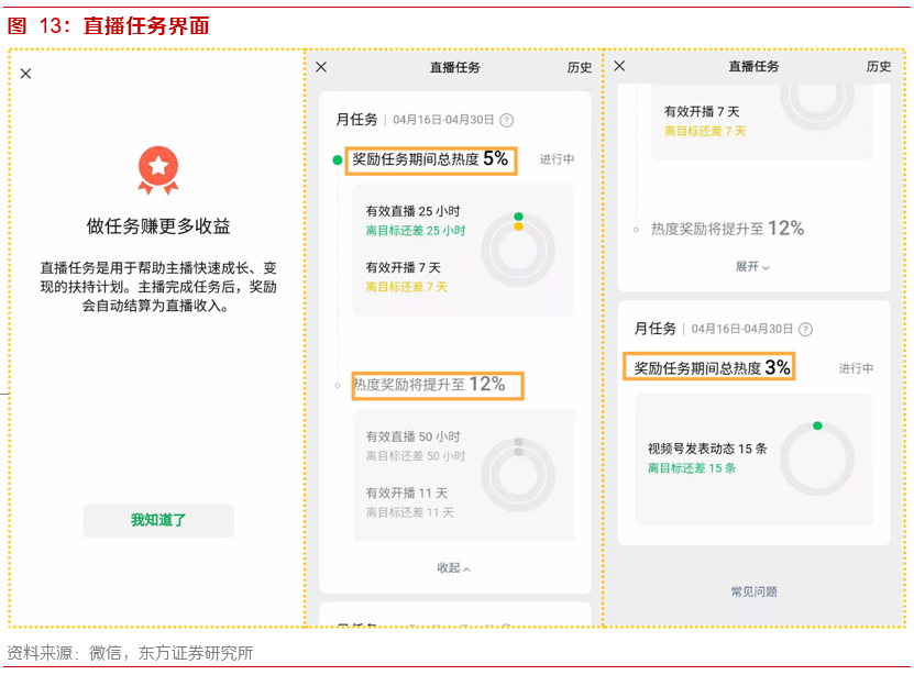 2 )直播商业化体系完善:视频号直播的打赏功能是20/12上线;视频号于21/4上线了直播任务(对完成任务的号主有现金奖励),并开放了直播公会/机构后台管理平台,据悉已有大型MCN机构入驻平台驻场,MCN机构和主播公会可以通过本平台管理管理主播,分配打赏奖励,甚至安排主播互相发布内容,机构平台的出现意味着着直播内容在逐步走上正规化。