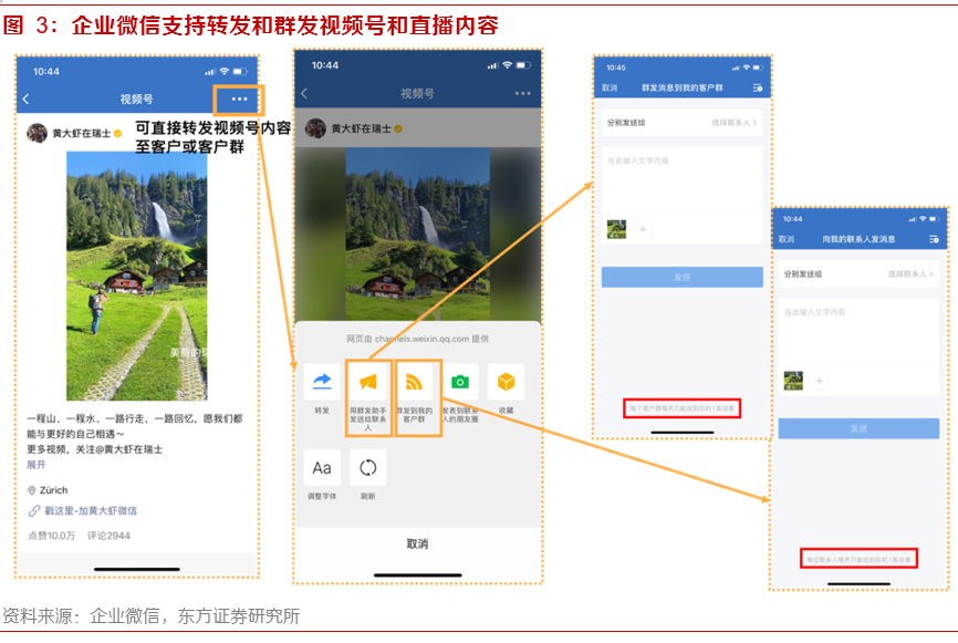 在企业微信端,用户可以使用企业微信直接观看视频号内容和微信直播内容,并且使用企业微信将这些内容评论给其他用户和用户群组。企业微信端支持内容的转发和群发相当于为企业和商家提供了一个低成本的宣传通道,品牌的宣传视频和企业的直播动态(例如产品发布会等活动)可以通过企业微信一键触达特定的客户和客户群。相较于企业过往使用公众号图文的宣传方式,视频号中视频化的表达带来的信息细节,表现效果更好。