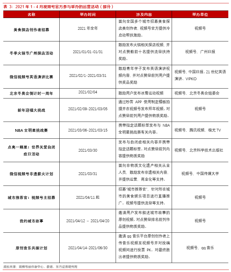 在大型活动方面,视频号有各类社区性质内容发布活动。春节后的3个月内,我们通过小程序“视频号创作者中心”统计了视频号运营活动的数据。2021/1/1-2021/4/1,有视频号官方参与的活动总共有28个。在这28个活动中,坚持以培养普通用户的使用,集中视频号平台内容种类为例如有和体育赛事合作意在鼓励用户分享运动以及才艺视频的活动,或者和媒体,慈善以及公益性质的活动。