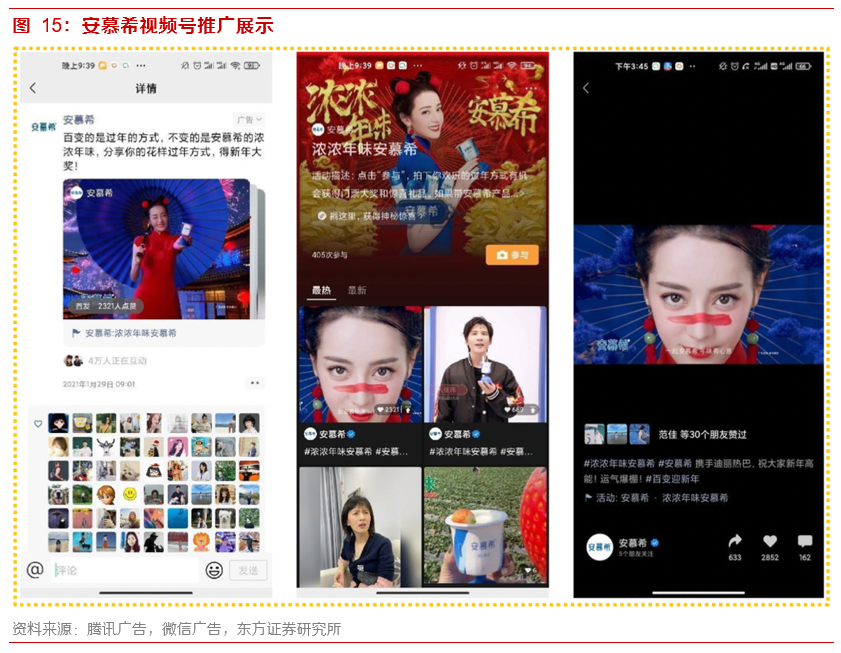 3.1 近期商业化动作在过去的观众中,视频号在商业化方面的升级包括:·春节期间,微信首次开始涉及到视频号的大型营销活动:浓年味安慕希浓密视频号。活动推广第一次完整的方案;