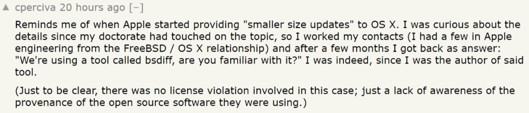 当苹果准备为 OS X 提供「更小尺寸的更新」时,我很好奇实现细节,因为我博士阶段的研究涉及到这个话题,所以我询问了苹果相关研究团队的成员,几个月后我得到回复:「我们正在使用一个名为 bsdiff 的工具,你熟悉它吗?」我确实很熟悉,因为我是这个工具的作者。