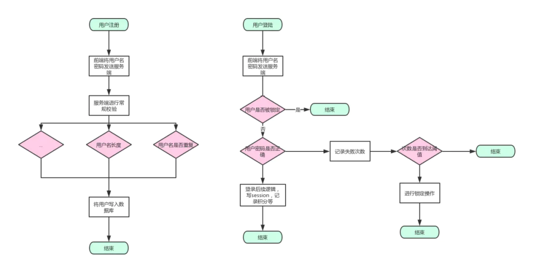 前端将用户名、密码发送到服务器,服务器进行常规的判断,判断用户名、密码长度是否满足,用户名是否重复等条件,条件不通过直接返回对应错误码给到前端,这里密码字段,为了防止传输过程中被截胡,建议加密再上传,我们的传输密码默认都是会进行一个md5加密,然后记录到数据库再进行一层加密,就算是脱库也没事,密码不要明文存储。