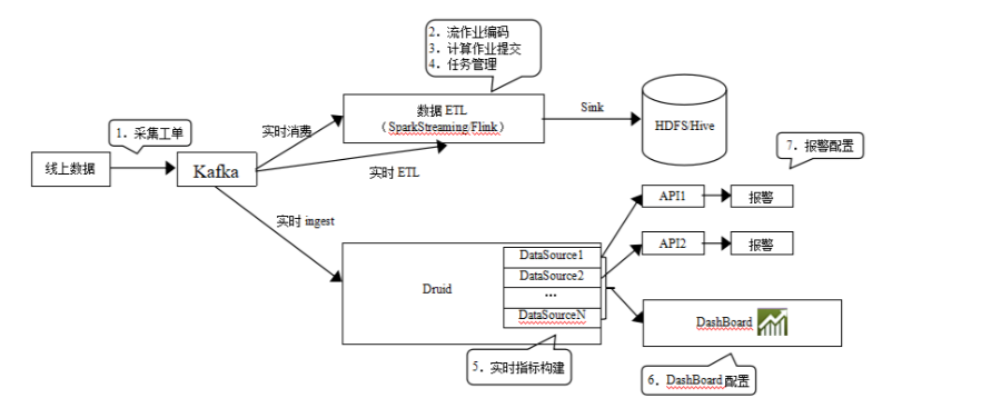 实时计算平台架构如图4所示。数据采集以后输出到Kafka消息队列,消费通道有两个,一个是数据ETL,使用Spark Streaming或者Flink将数据进行清洗、转换、处理后记录到HDFS中,供后续批处理计算;另一个通道是Druid,计算实时监控指标,将结果输出到报警系统和实时图表系统DashBoard,如图4所示。
