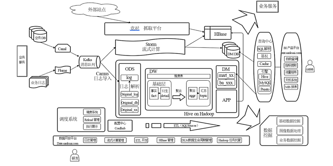 淘宝可能是中国互联网业界较早搭建了自己大数据平台的公司,图1是淘宝早期的Hadoop大数据平台,比较典型。