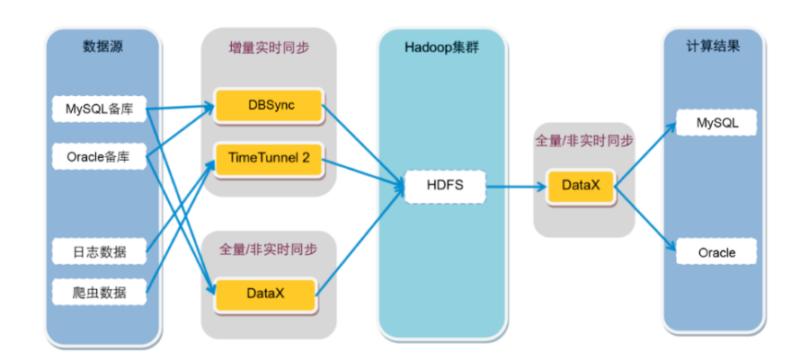 数据源主要来自Oracle和MySQL的备库,以及日志系统和爬虫系统,这些数据通过数据同步网关服务器导入Hadoop集群。其中,DataExchange非实时全量同步数据库数据,DBSync实时同步数据库增量数据,TimeTunnel实时同步日志和爬虫数据。数据全部写入HDFS。