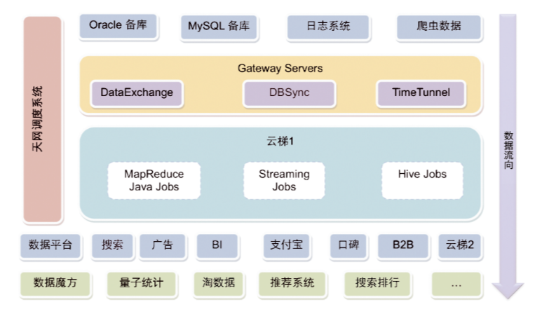 淘宝的大数据平台基本分成三部分,上面是数据源与数据同步模块;中间是云梯1,即淘宝的Hadoop大数据集群;下面是大数据的应用,即使用大数据集群的计算结果。