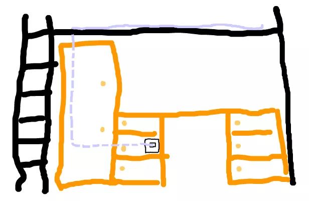 为了不暴露没电脑还插着根网线那么荒唐,于是尽量沿着有遮挡的柜子布线,从衣柜后一直拖到床铺。剩下的水平部分就埋在床边的缝隙里,并用席子盖着。