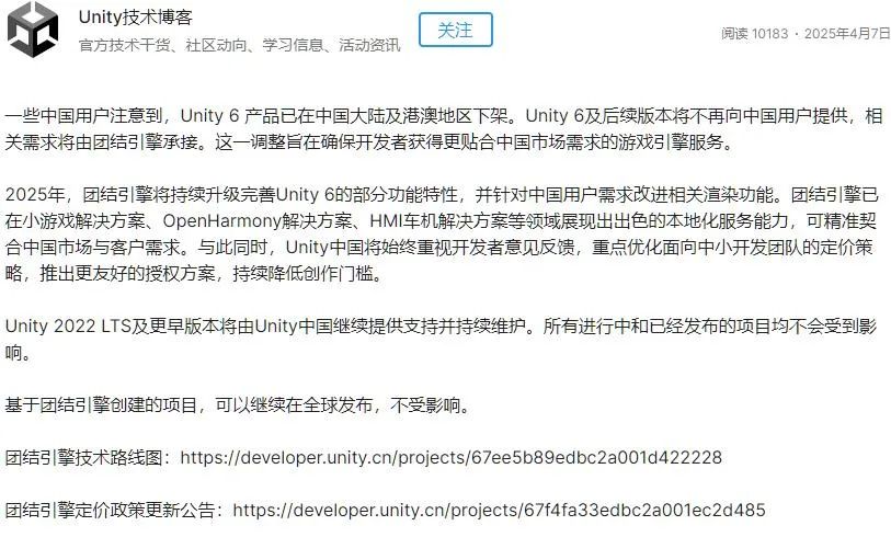 Unity公告表示:“一些中国用户注意到,Unity 6 产品已在中国大陆及港澳地区下架。Unity 6及后续版本将不再向中国用户提供,相关需求将由团结引擎承接。这一调整旨在确保开发者获得更贴合中国市场需求的游戏引擎服务。Unity 2022 LTS及更早版本将由Unity中国继续提供支持并持续维护。所有进行中和已经发布的项目均不会受到影响。”
