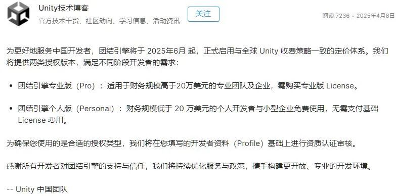 Unity中国还公布了团结引擎的收费方案,其表示:“团结引擎将于 2025年6月起,正式启用与全球 Unity 收费策略一致的定价体系。我们将提供两类授权版本,满足不同阶段开发者的需求。”