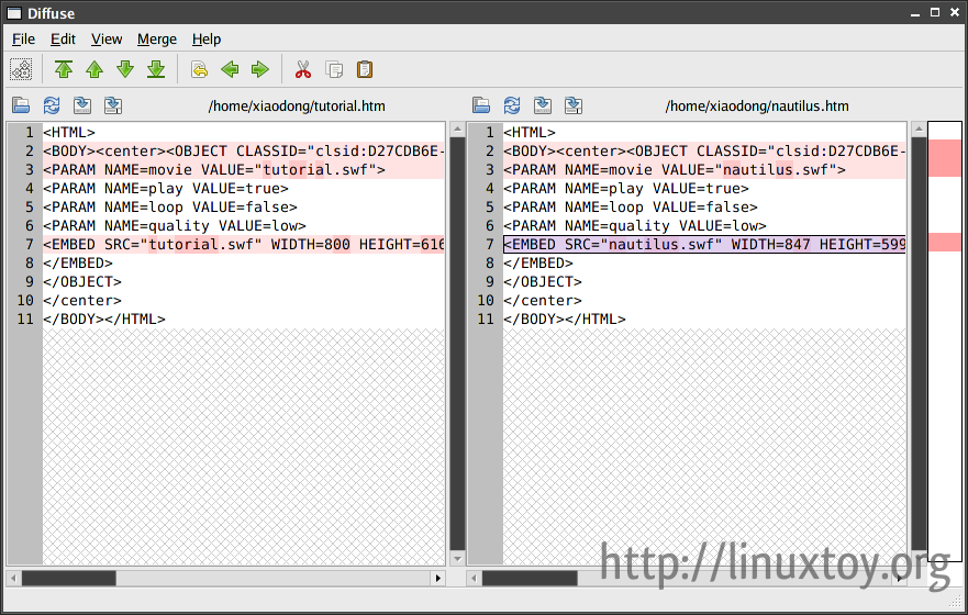 Diffuse在命令行中的速度是相当快的,支持像 C++、Python、Java、XML 等语言的语法高亮显示。可视化比较,非常直观,支持两相比较和三相比较。这就是说,使用 Diffuse 你可以同时比较两个或三个文本文件。