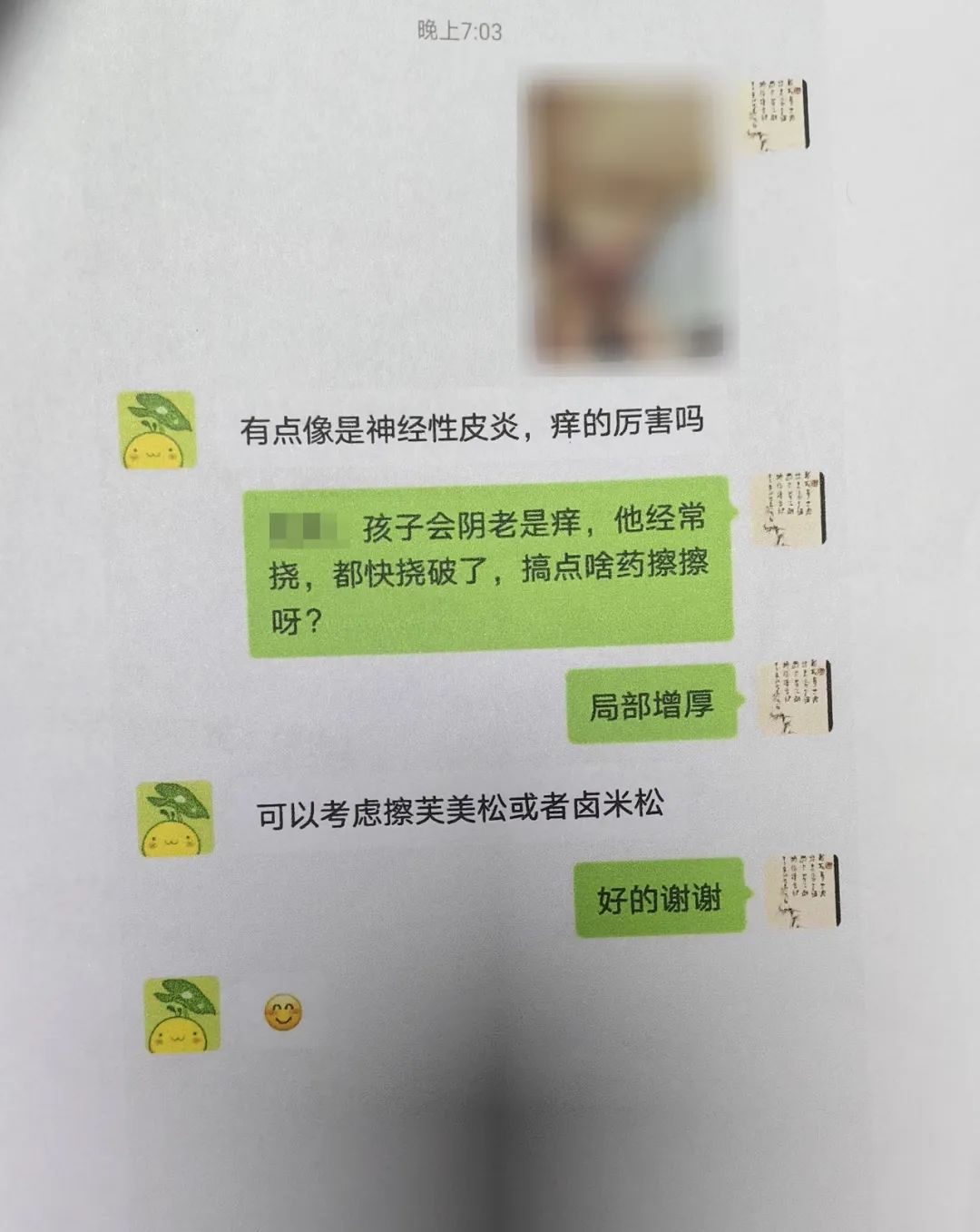 肖母提供了2020年之后,与医护人员、药店、友人询问湿疹治疗的聊天记录。事发当天中午,她曾委托来做客的友人顺便到药店买“爱宁达”药膏。肖某某的父亲向不同的医生咨询,发过肖某某隐私部位的照片,说肖某某的会阴处、睾丸部“老是痒,快挠破了”,询问过是否要替换“爱宁达”。