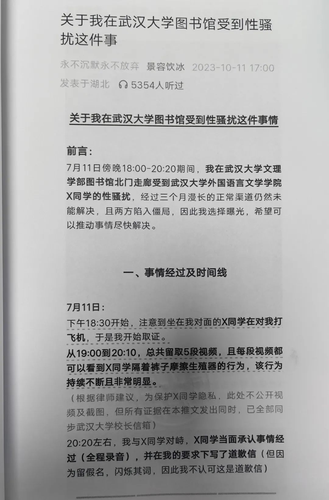 2023年10月11日,武汉大学女生杨某发文称,在图书馆自习时被肖某某性骚扰。 两天后,武大发布通报给予肖某肖记过处分,但未陈述肖某某具体违规违纪行为。