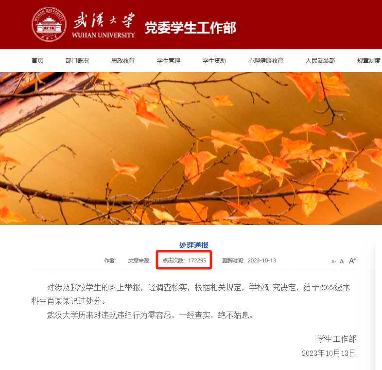 7月31日,武汉大学官网男生受处分通报仍未删除,点击量超17万。