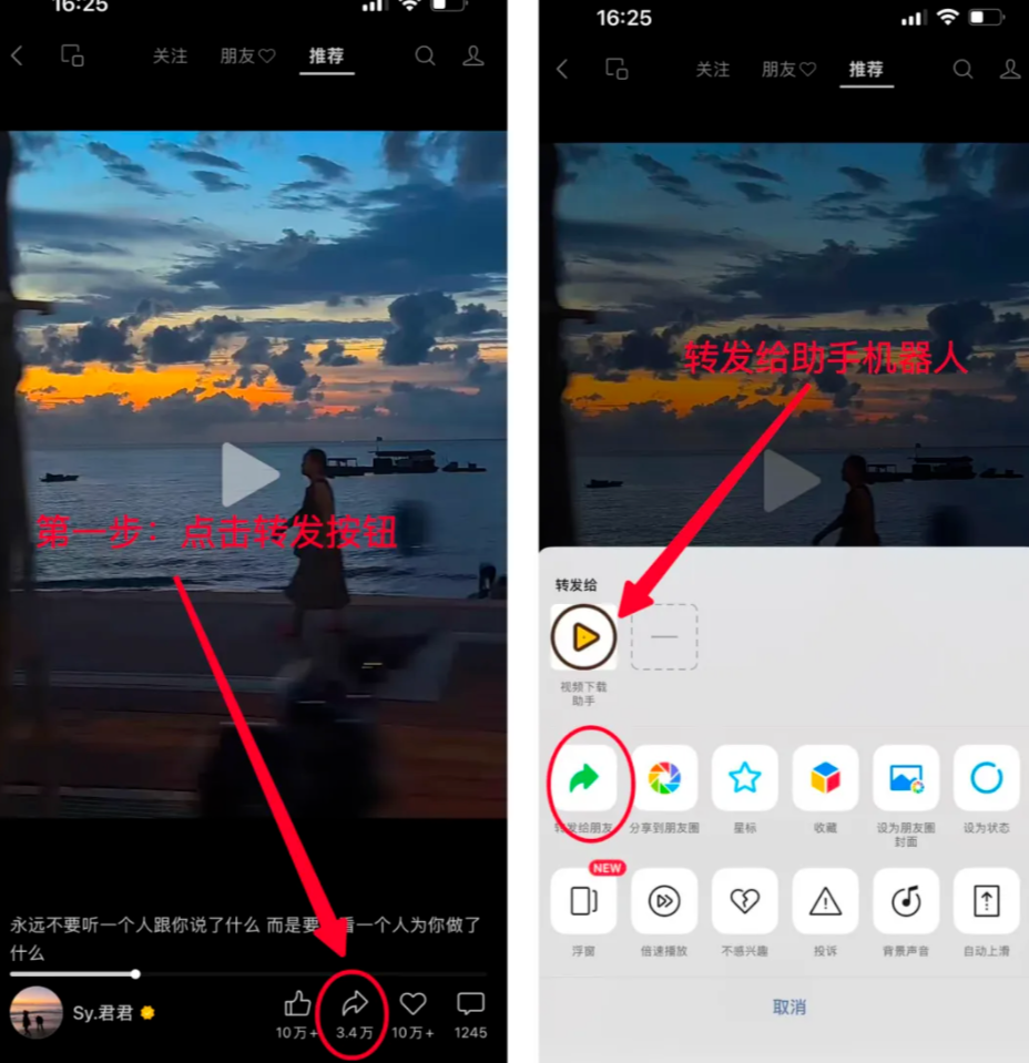打开视频号视频,点击下方的分享按钮,把视频转发分享给下载助手机器人