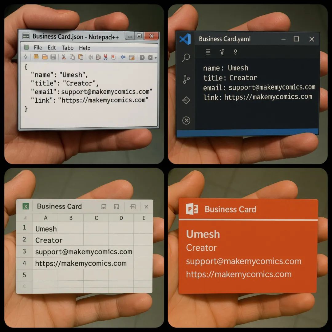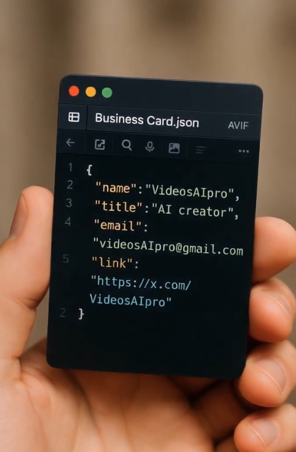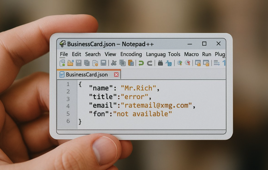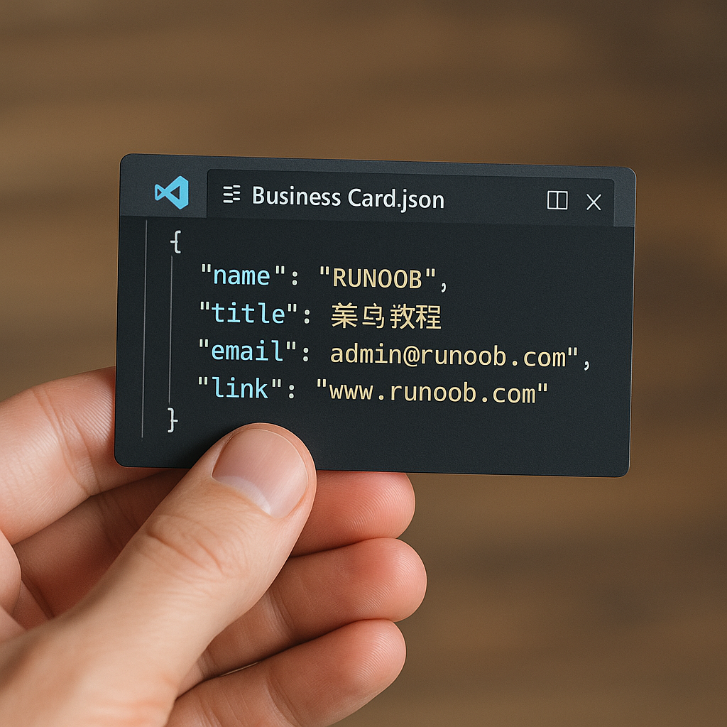 特写镜头:一只手正拿着一张设计成 VS Code 中 JSON 文件外观的名片。名片上的代码以真实的 JSON 语法高亮格式呈现。窗口界面包含典型的工具栏图标和标题栏,标题显示为 Business Card.json,整体风格与 VS Code 界面完全一致。背景略微虚化,突出展示名片内容。