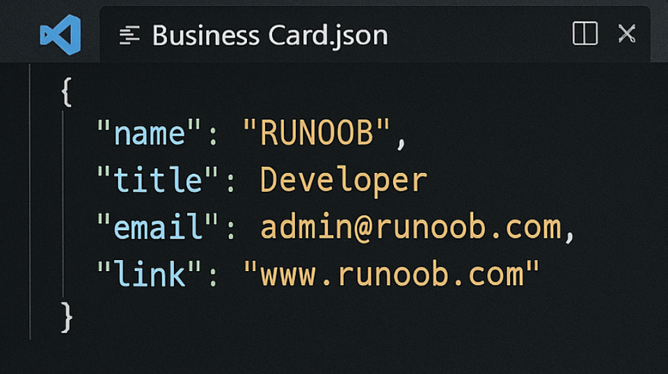 一张插画特写,展示一只手拿着一张名片。这张名片被设计成在【VS Code】编辑器中打开的【JSON】文件样式。名片上的内容为采用【JSON】语法高亮格式的代码,包含清晰可见的键值对,比如:
