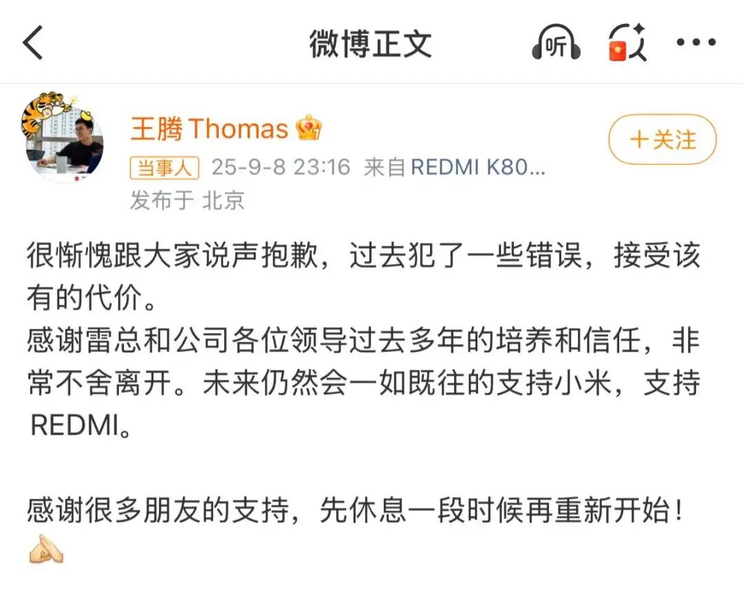 感谢雷总和公司各位领导过去多年的培养和信任,非常不舍离开。未来仍然会一如既往的支持小米,支持REDMI。