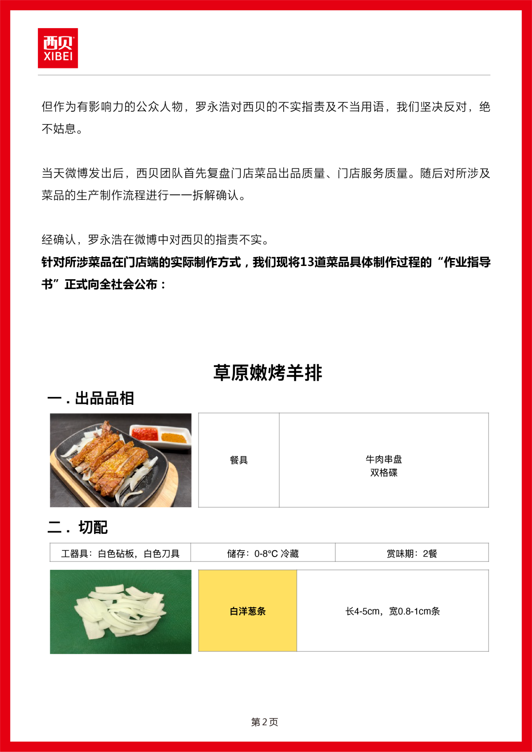 西贝在信中指出,经核查确认,罗永浩此前在微博中对西贝的相关指责并不属实。针对所涉菜品在门店端的实际制作方式,西贝正式向全社会公布13道菜品具体制作过程的 “作业指导书”,表示菜品制作过程的描述,均基于西贝门店真实的现场加工行为,以此回应外界质疑。