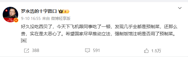 9月10日,知名企业家、微博大V罗永浩通过社交平台发文称:“好久没吃西贝了,今天下飞机跟同事吃了一顿,发现几乎全都是预制菜,还那么贵。希望国家尽早推动立法,强制饭馆注明是否用了预制菜。”