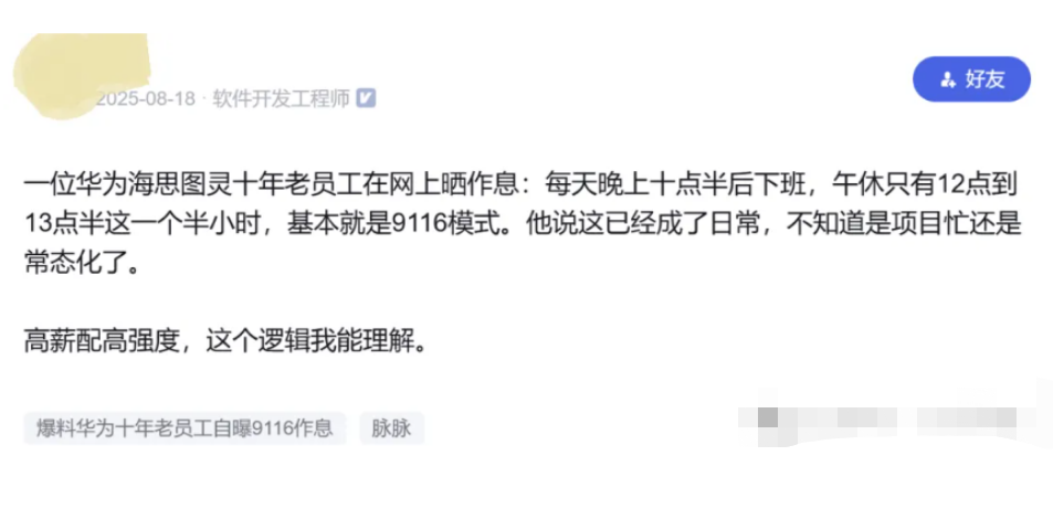 有位在华为干了十来年的老员工,最近爆料了他如今在海思图灵的真实状态:晚上基本10点半以后才能走,午休固定在12点到13点半,加班节奏接近9116。听起来像段子,但那是他的日常。