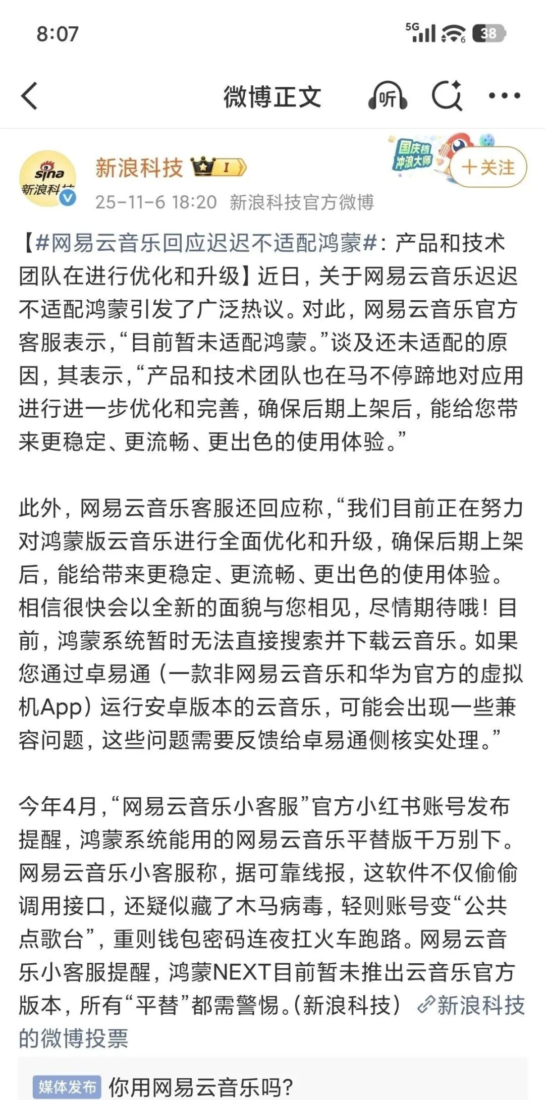 原生鸿蒙系统测试已有一年多,可网易云音乐在适配这件事上始终不温不火,网易云音乐迟迟不适配鸿蒙引发了网友热烈讨论。