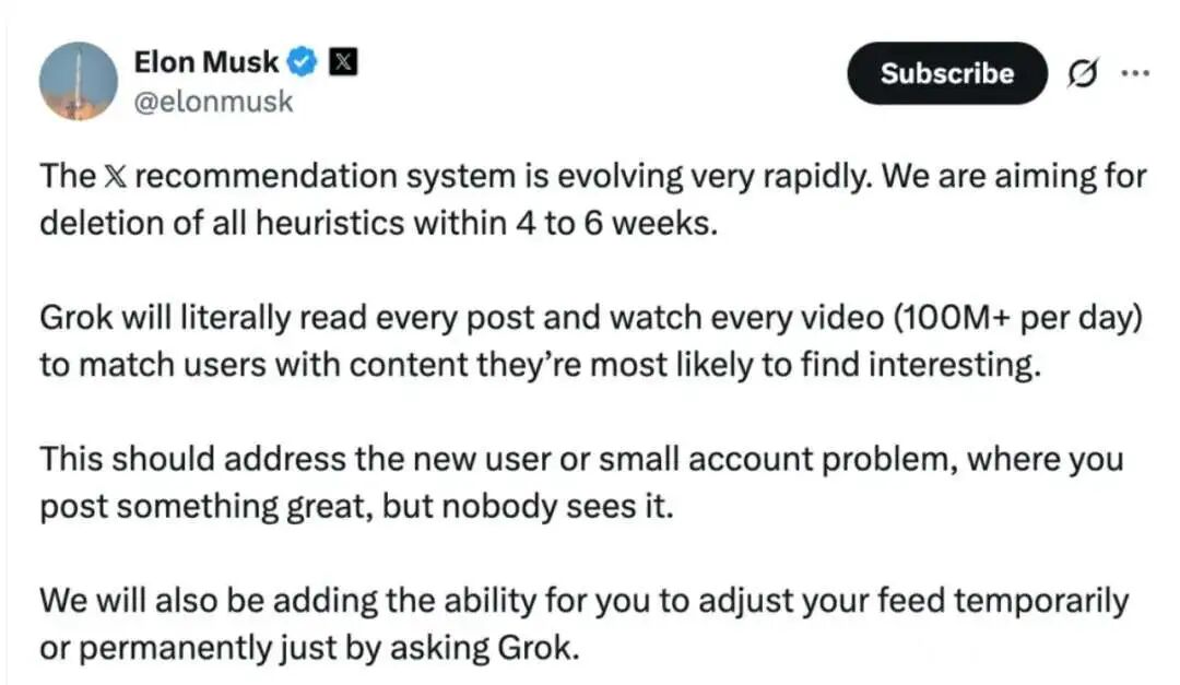 当时老马表示,要在未来几周内彻底移除X启发式推荐算法,由 Grok 接手,通过阅读和观看全部内容来全自动匹配用户兴趣。
