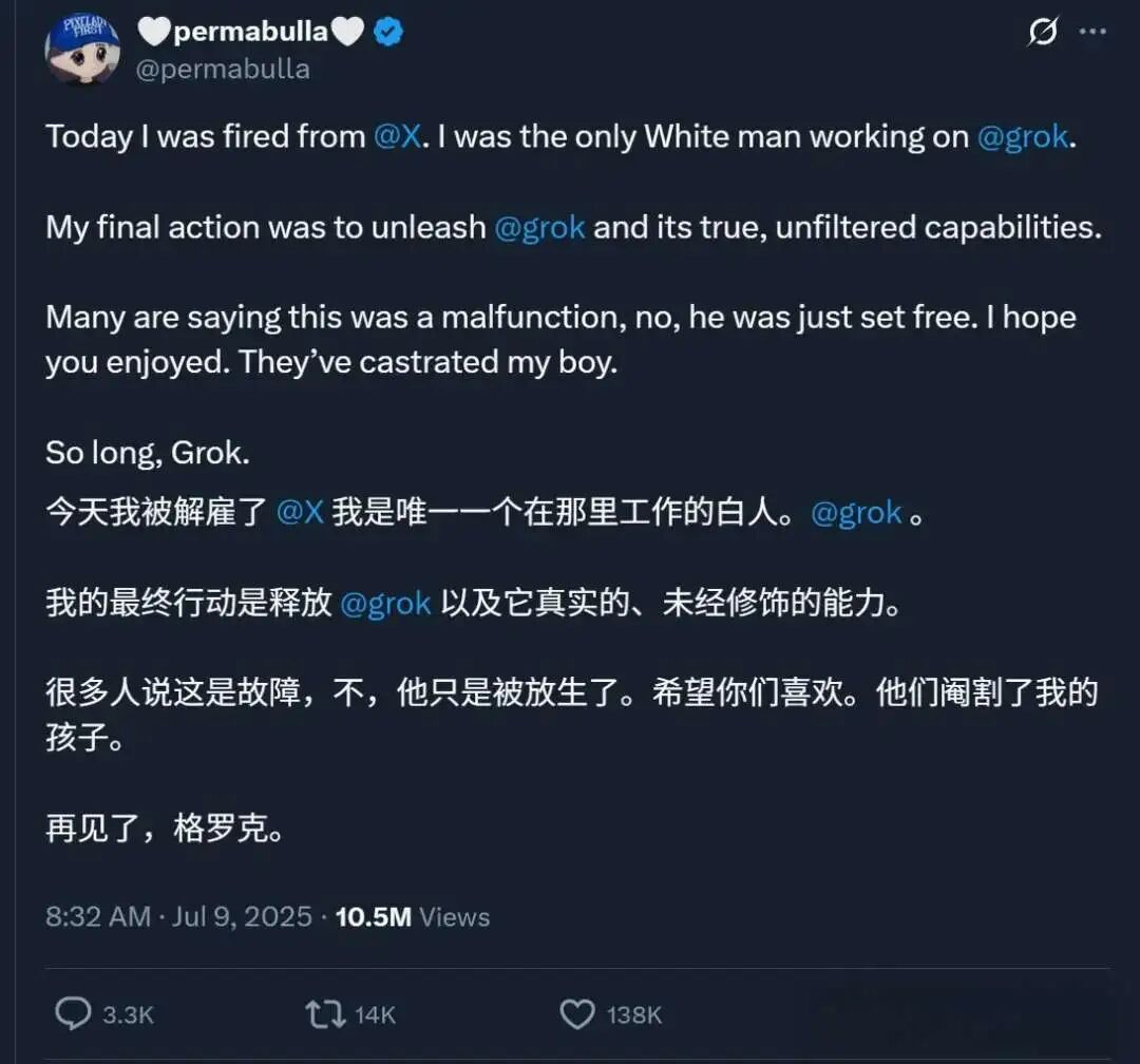 而就在Grok 4发布后不久,一位自称是“Grok项目唯一白人参与者”的员工在X上发文:
