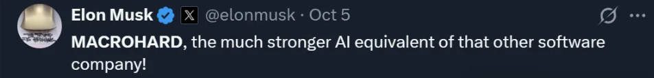 与此同时,他还在推进“巨硬(Macrohard)计划”——用 AI 自动化软件开发。他表示:
