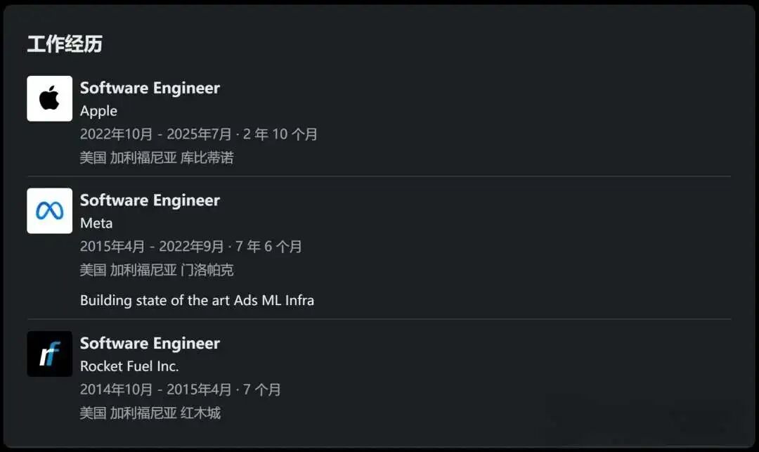 后来不知道是不是受到Dima影响,去了Meta从事广告机器学习工作,之后于2022年至2025年在苹果工作。