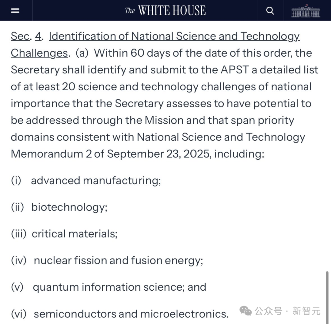 行政令明确列出了至少20项具有国家重要性的科技挑战,并划定了首批六大优先攻克领域: