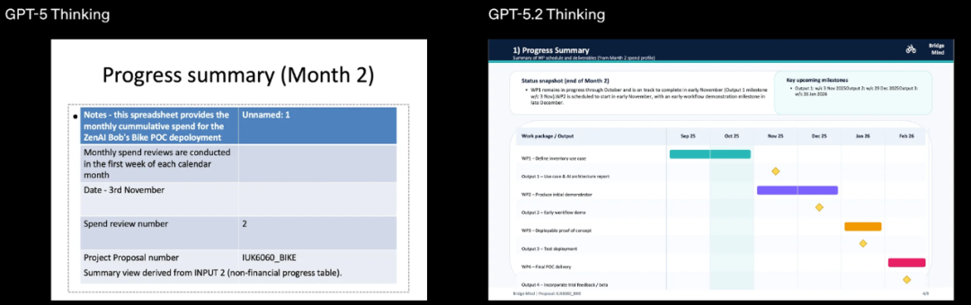 对比显示,GPT-5.2 Thinking 在生成电子表格与演示文稿时,在专业度与排版质量上都有显著提升: