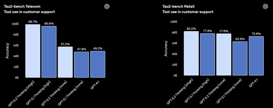 GPT-5.2 Thinking 在 Tau2-bench Telecom 上取得了 98.7% 的新 SOTA 成绩,展示了其在长链路、多轮任务中可靠使用工具的能力。