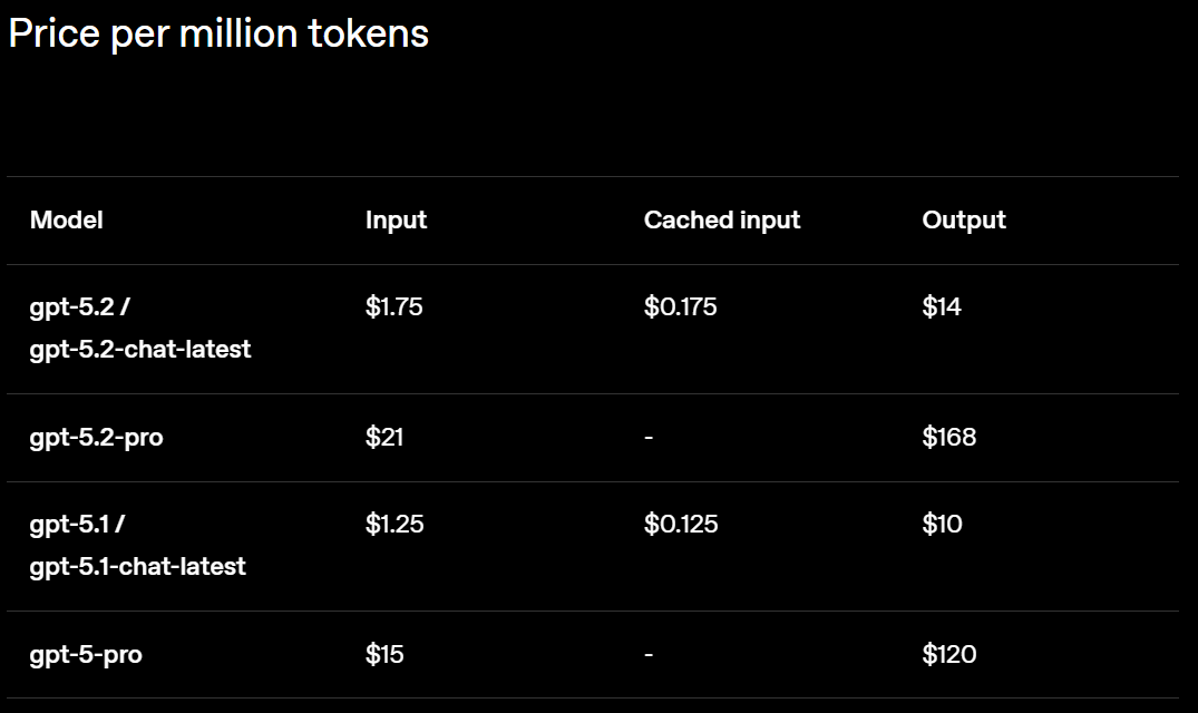 以下是百万 token 的价格,OpenAI 称,尽管 GPT-5.2 的单个 token 成本更高,但由于其更高的 token 效率,达到特定质量水平的总成本反而更低。