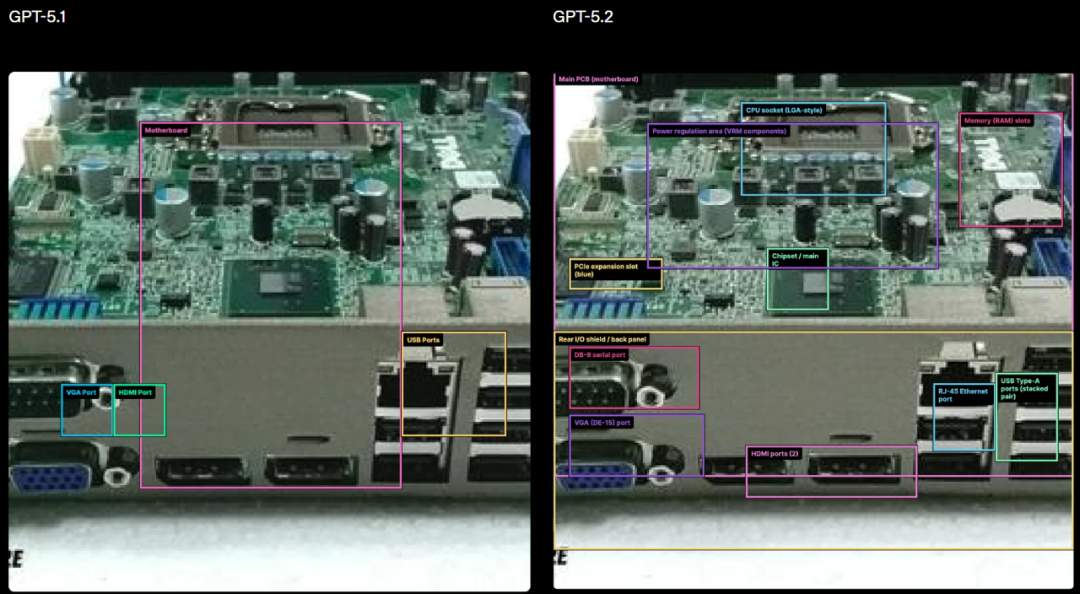 在下方的示例中,OpenAI 要求模型识别输入图像(本例中为主板)中的组件,并返回带有大致边界框的标签。即使在低质量图像上,GPT-5.2 也能识别出主要区域,并放置有时能与每个组件真实位置相匹配的框;而 GPT-5.1 仅标记了少数几个部分,且对其空间排列的理解要弱得多。
