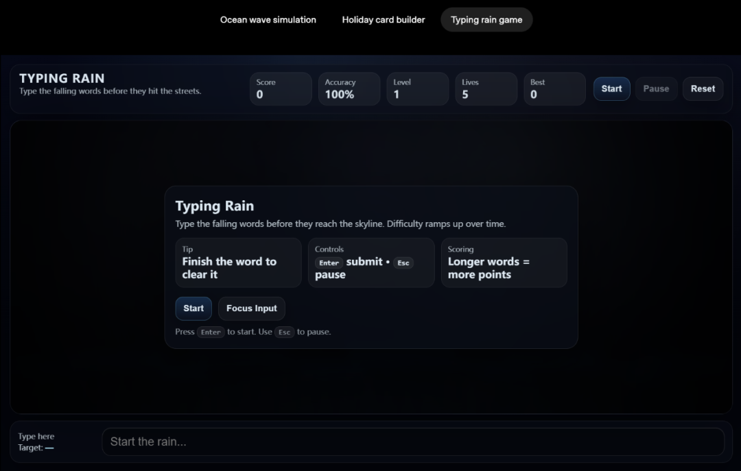 GPT-5.2 Thinking 在前端工程能力上也优于 GPT-5.1 Thinking。早期测试者发现,它在前端开发以及复杂或非常规的 UI 设计(尤其是包含 3D 元素 的界面)方面的能力显著增强,使其成为全栈工程师的强大日常助手。