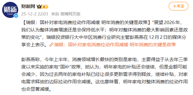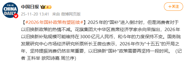 此外,近日国务院发展研究中心市场经济研究所原所长、二级研究员王微也透露,2026年作为“十五五”的开局之年,坚持提振消费仍然非常重要,以旧换新“国补”政策需要再坚持一段时间。