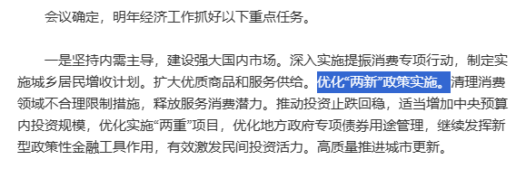 所谓“两新”政策,是指大规模设备更新和消费品以旧换新政策,后者被称为“国补”。这意味着明年会继续实施“国补”政策,但核心规则将优化调整。