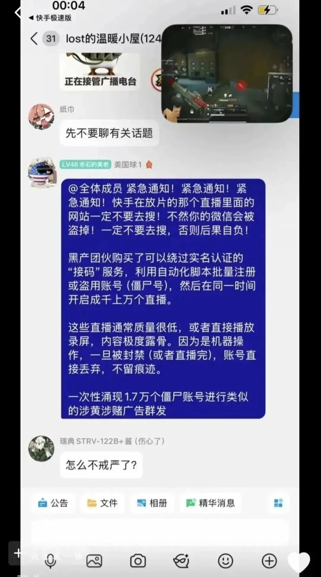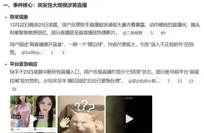事件的扩散速度远超预期。12月22日晚,首批异常内容陆续冒头:涉黄画面与低俗表演借助批量账号同步铺开,传播链条迅速拉长,导致用户举报入口短时间内被挤爆,不少人反映“连续举报20分钟仍未见处理”。23日零点前后,直播板块几近失序——部分合规主播在无预警情况下被强制下播,普通用户进入直播频道则频繁遭遇“加载失败”。为防止风险进一步外溢,快手启动了高强度应急处置:清空直播频道内容、临时关停直播功能,并一度将App首页的“直播”入口下线。直至次日凌晨,这场攻防对抗才逐步降温并恢复秩序。