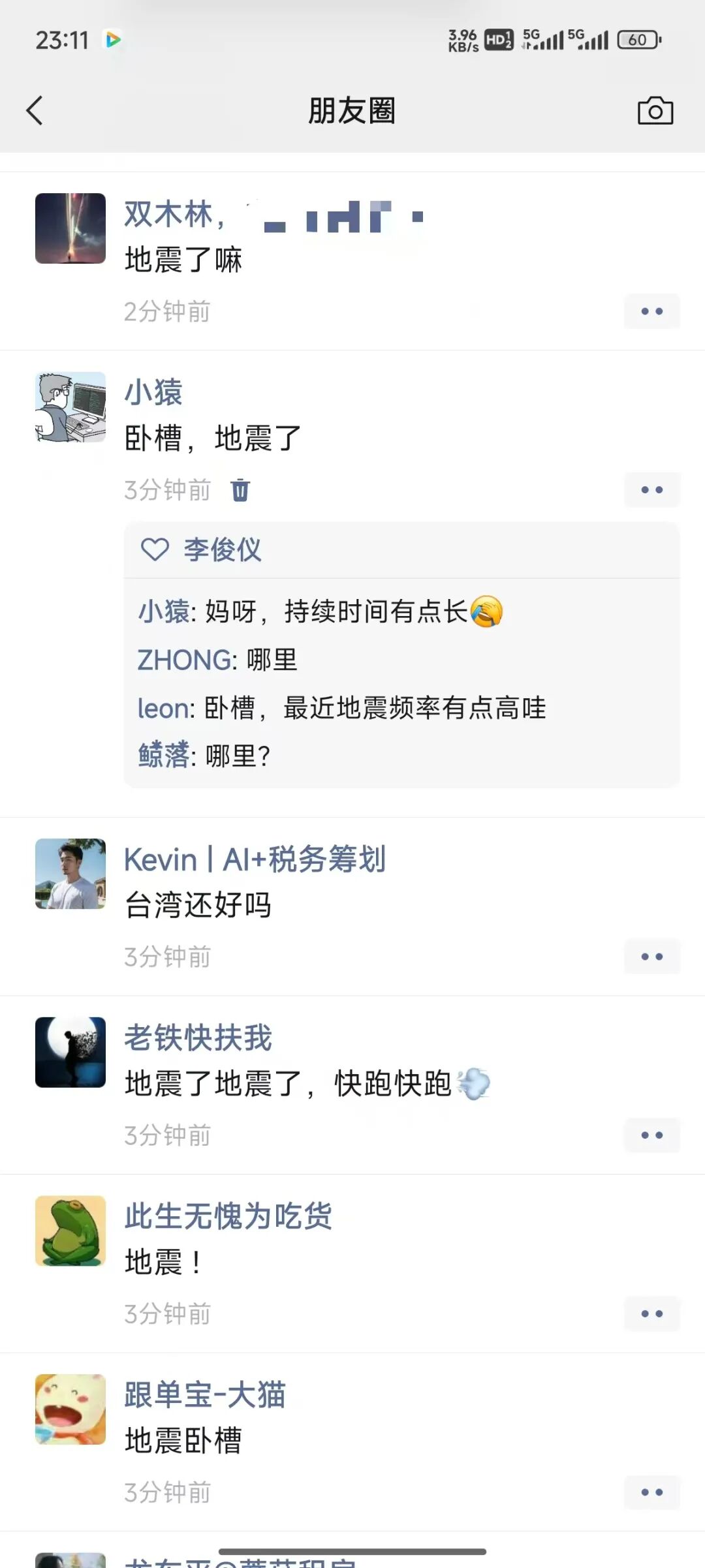 朋友圈里,大家纷纷分享了各自的震感体验。有人急忙穿上内裤站在绿化带上,有人冷静到在慌乱中带着黄金下楼,还有人慌张地开起了外卖,想以此来压惊。不论大家的反应如何,却在这个寒冷的夜晚,展示了福建人面对地震时的从容与幽默。