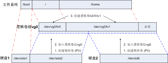 LVM的逻辑卷类似于非LVM系统中的硬盘分区,在逻辑卷之上可以建立文件系统(比如/home或者/usr等).