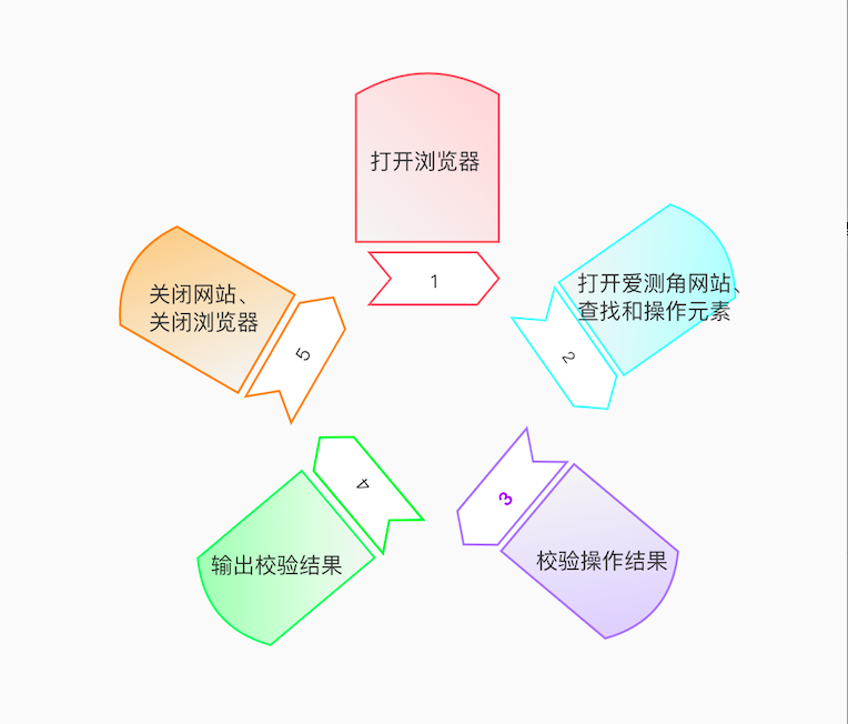 如图2-1所示,【爱测角】网站的回归测试的操作内容可以归纳为五个步骤。第一步,测试前,打开浏览器;第二步,打开网站后查看和操作页面的元素;第三步,验证页面显示和操作结果是否符合预期;第四步,记录和输出验证结果;第五步,测试后,关闭网页和浏览器。