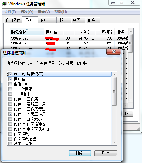 同时打开任务管理器,选择“进程”选项卡,通常情况下,在进程列表中是不会显示PID的,这个时候可以通过点击“查看”>“列选项”勾选出PID,以方便我们查看,同时也可以将不必要的选项勾掉,比如CPU占有率等。