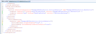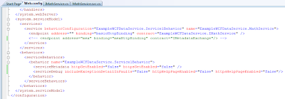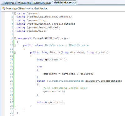 In WCF Data Services, this functionality seems more complete and it is just as easy to implement as in the last article. Simply set the "includeExceptionDetailInFaults" attribute to "false" in the "serviceDebug" XML element of the Web.config file.
