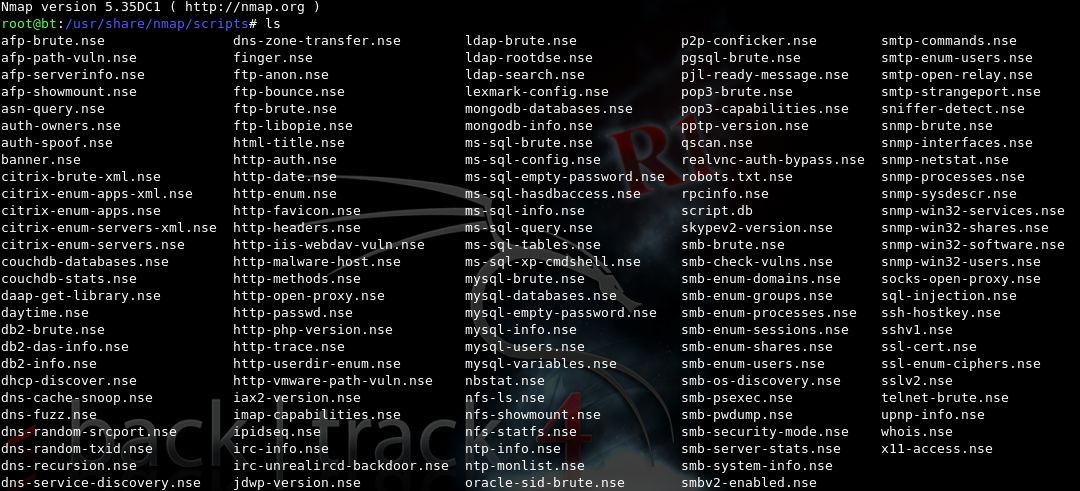 First, we obviously need NMAP installed. For this tutorial I’ll be using Backtrack4-R1, which currently has NMAP 5.35DC1 installed. If you look in the directory /usr/share/nmap/scripts you’ll see all sorts of scripts that do some really helpful things on a test.